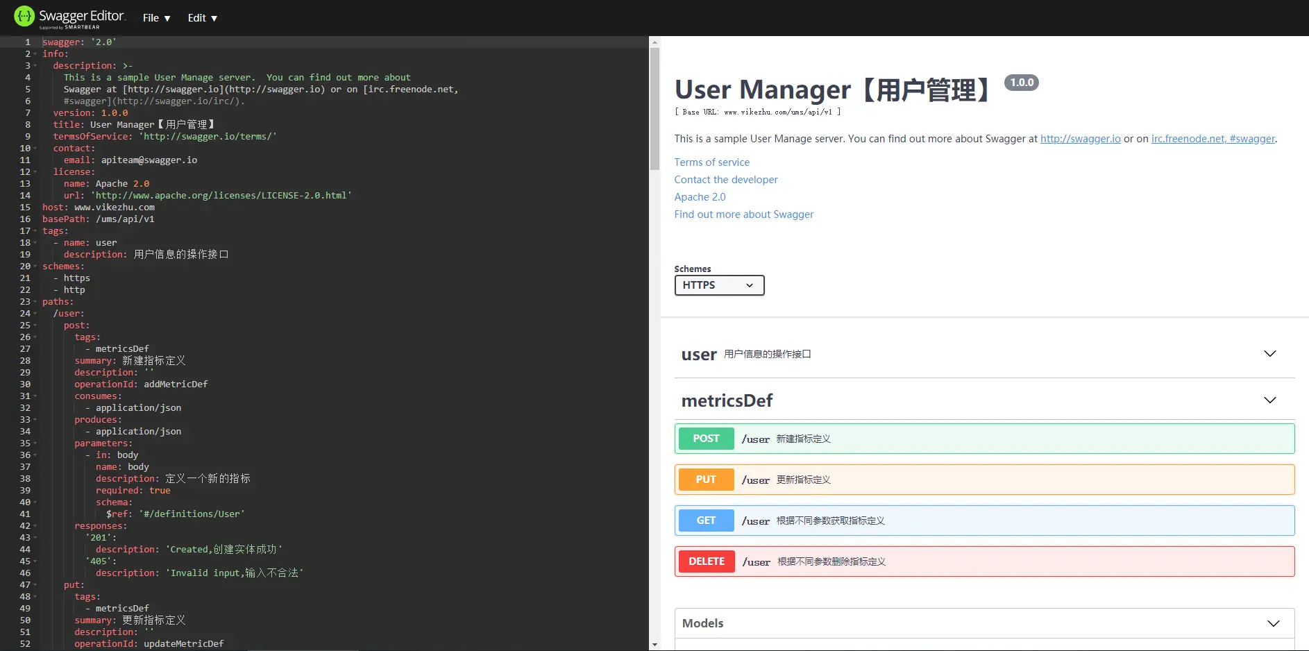 首先用swagger-editor定义我们项目的数据模型和接口文档。这里我们以实现一个简单的用户管理系统为目标,实现用户数据的增删改查功能。