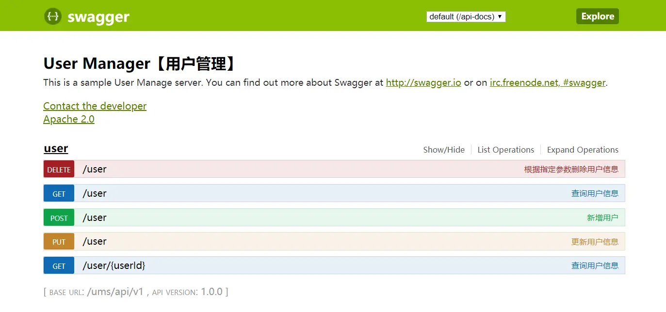 工程的入口类为basePackage下的Swagger2SpringBoot.java,运行该类,当控制台打印诸如:Started Swagger2SpringBoot in 7.032 seconds (JVM running for 8.761)的内容时,说明应用启动成功。打开浏览器,输入地址: http://localhost:8080/ums/api/v1/swagger-ui.html (默认端口为8080),若显示如下页面,说明应用启动成功。