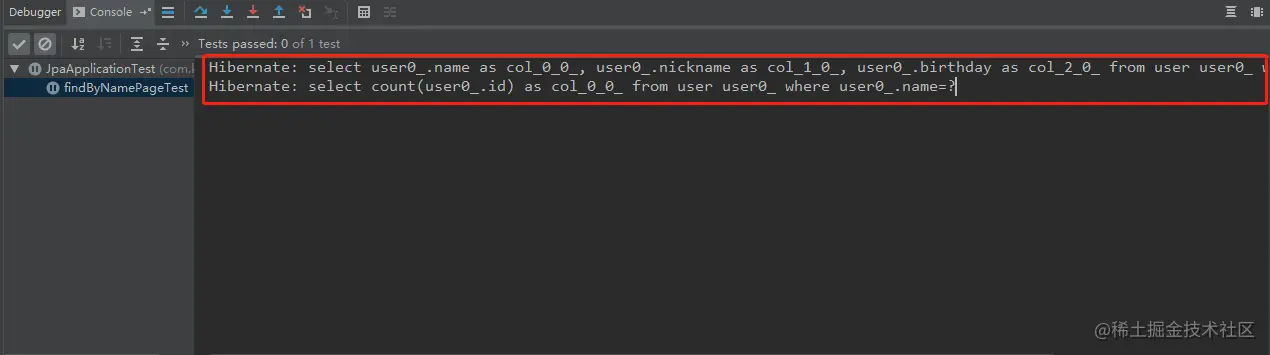 @Test public void findByNamePageTest() { Pageable pageable = PageRequest.of(0, 1); Page<UserDTO2> page = dao.findByUserName("tom", pageable); page.getContent().forEach(user -> System.out.println(user.toStringInfo())); System.out.println("条数:" + page.getTotalElements()); }通过配置输出SQL,可以在控制台看到输出的SQL语句是两条