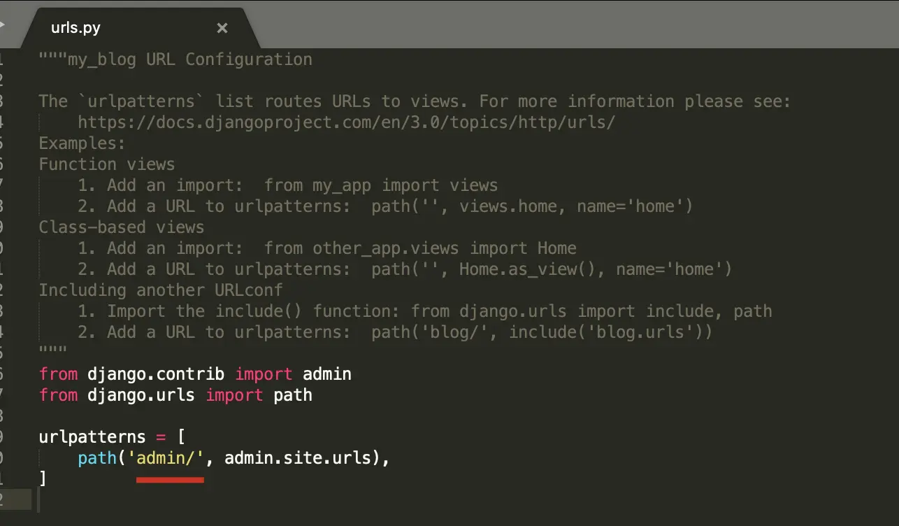 urlpatterns = [ path('admin/', admin.site.urls), path('',include('blog.urls')), ] - 修改blog的urls.py