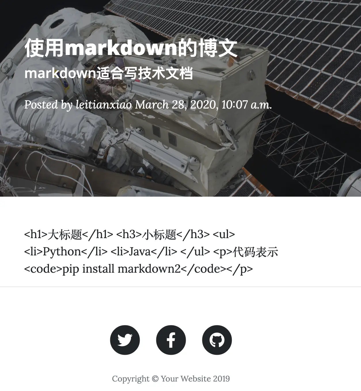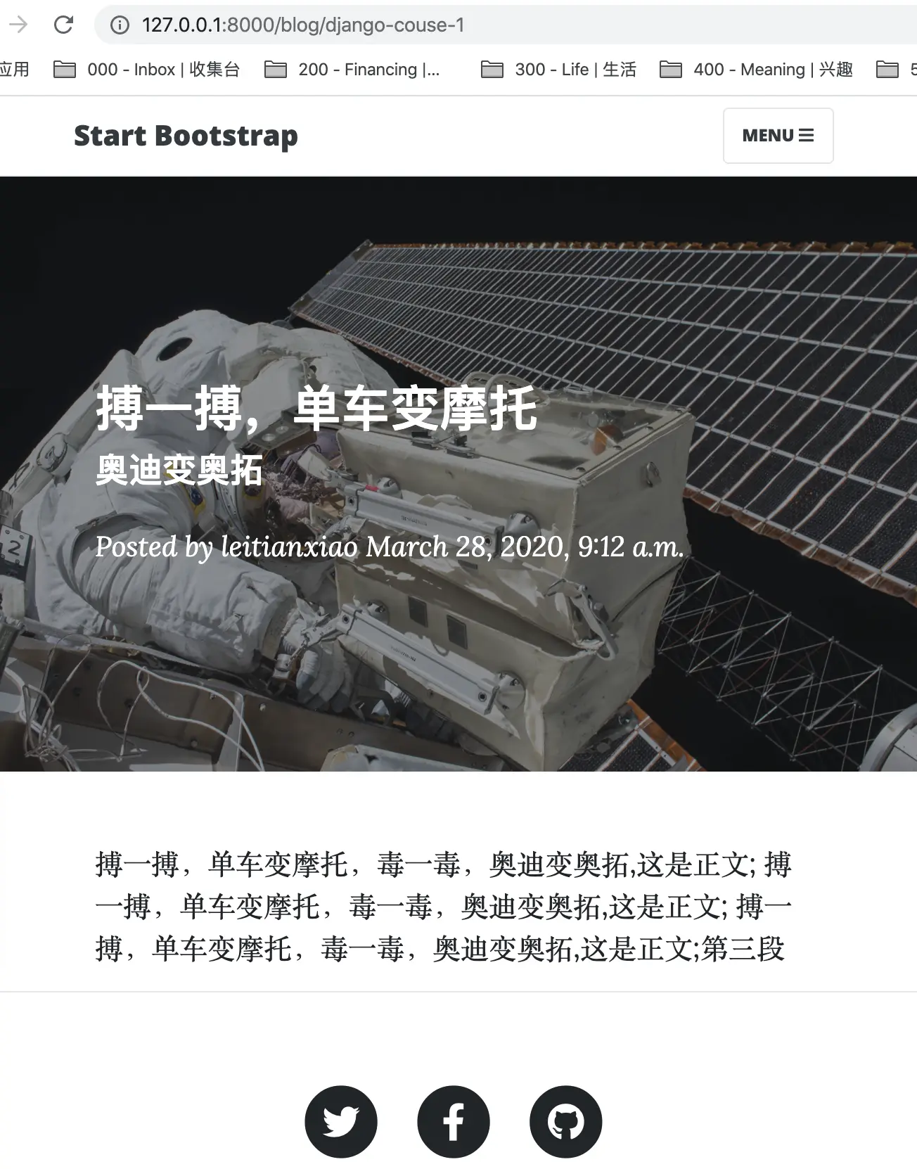 def blog_detail(request,blog_link): post=get_object_or_404(Post,link=blog_link) post.content = markdown2.markdown(post.content) # 返回博文详情 return render(request,'blog/post.html',{'post':post}) -