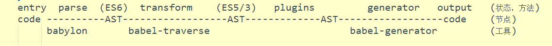 接下来我们对AST这个节点进行展开,AST在parse后,原来entry文件使用的代码语法为es6(也有可能是es7/8/9/10,这里仅仅举例方便说明)不会发生改变,(transform)改变的仅仅是code->AST,也就是代码形式->抽象语法树,从能被浏览器运行->不能被浏览器运行。