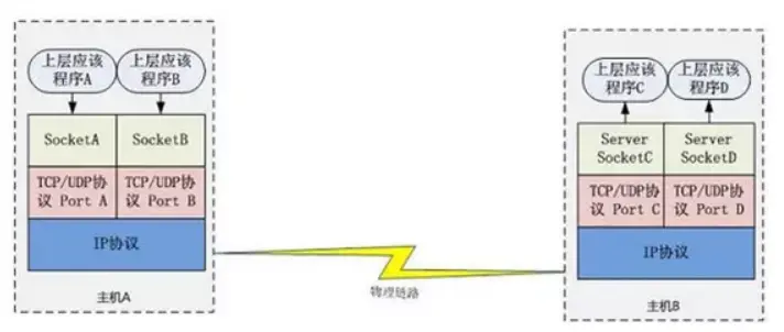 主机 A 的应用程序要能和主机 B 的应用程序通信,必须通过 Socket 建立连接,而建立 Socket 连接必须需要底层 TCP/IP 协议来建立 TCP 连接。建立 TCP 连接需要底层 IP 协议来寻址网络中的主机。我们知道网络层使用的 IP 协议可以帮助我们根据 IP 地址来找到目标主机,但是一台主机上可能运行着多个应用程序,如何才能与指定的应用程序通信就要通过 TCP 或 UPD 的地址也就是端口号来指定。这样就可以通过一个 Socket 实例唯一代表一个主机上的一个应用程序的通信链路了。