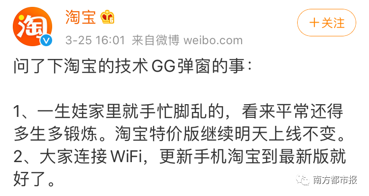 对此,淘宝官方微博昨天下午回应称:“大家连接WiFi,更新手机淘宝到最新版就好了。”18时许,南都君打开手机淘宝iOS版,并无到期弹窗提示。