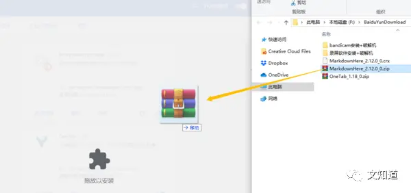 3、将下载好的.zip文件拖拽到上一步的页面,将会出现“拖放已安装”标识