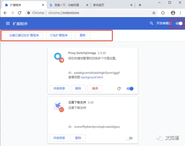 2、点击右上角的“开发者模式”,出现下图中的三个按钮即表示已打开开发者模式。