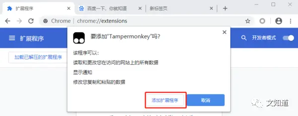 4、完成拖放之后,将会出现插件的安装提示,点击“添加拓展程序”即可安装成功,安装成功后建议关闭“开发者模式”。