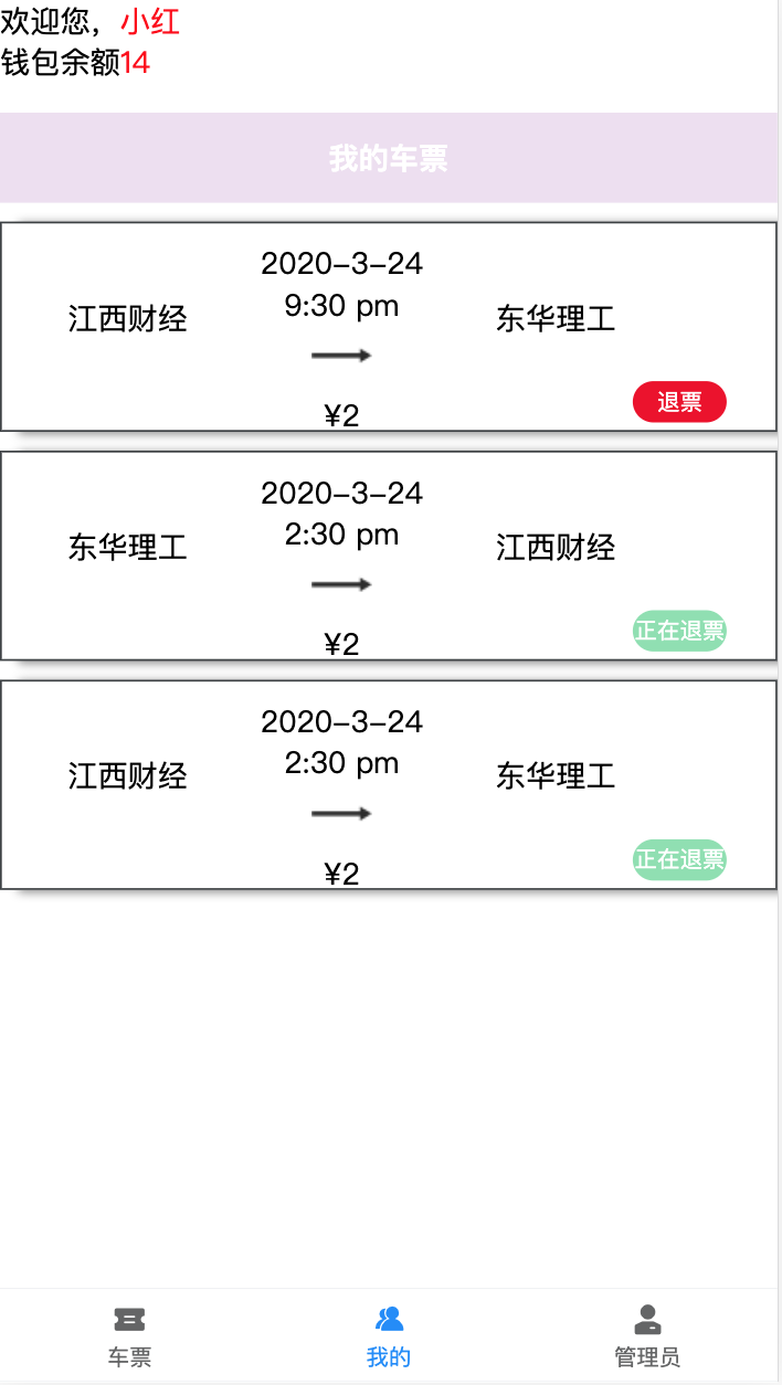 显示客户当前钱包余额,已购买的票以及退票功能