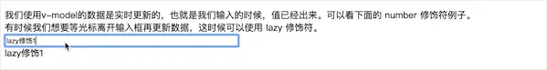 我们使用v-model的数据是实时更新的,也就是我们输入的时候,值已经出来。 有时候我们想要等光标离开输入框再更新数据,这时候可以使用 lazy 修饰符。