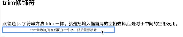 跟普通 js 字符串方法 trim 一样。就是把输入框首尾的空格去掉,但是对于中间的空格没用。