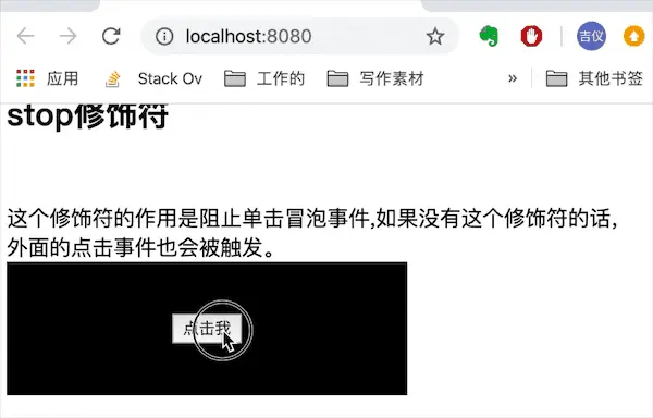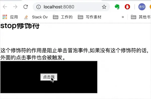 上面的代码中外面的div 也有一个点击事件,如果没有 stop修饰符 的话,点击 button 会触发外面的点击事件。