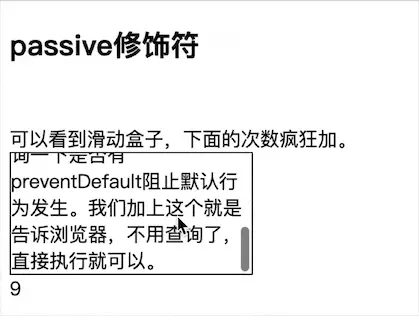 这个修饰符的作用是滚动事件的默认行为 (即滚动行为) 将会立即触发。不会等待onScroll完成。这个在移动端上面能提升很大的性能。 因为每次滚动事件都会去查询一下是否有preventDefault阻止默认行为发生。我们加上这个就是告诉浏览器,不用查询了,直接执行就可以。