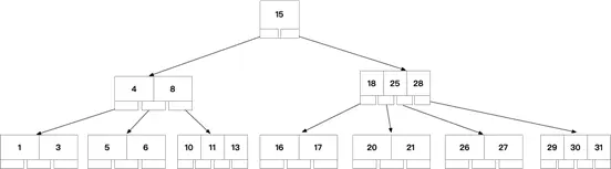 - 叶子之间,增加了链表(图中红色箭头指向),获取所有节点,不再需要中序遍历,使用链表的next节点就可以快速访问到