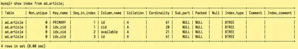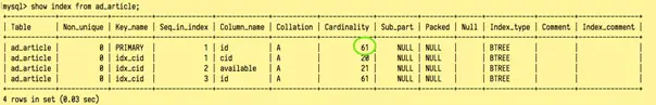 说完BTREE,在'showindex from ad_article'结果集中有一列为Cardinality的值,它的作用也非常的大,称之为:索引基数