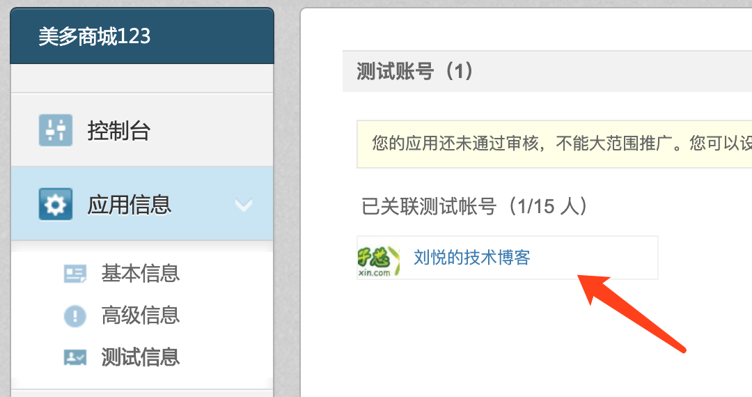 接下来的情况就有点操蛋了,因为新浪规定应用如果不通过审核,那么新浪有些接口无权限请求的,可以说你手里只有access_token和uid,却换不到别的东西,怎么办呢,没有人会闲的没事为了测试接口就去弄个营业执照,但是有一个曲线救国的方法,就是在测试信息页面来添加测试账号,添加好测试账号之后,就可以请求相应的接口