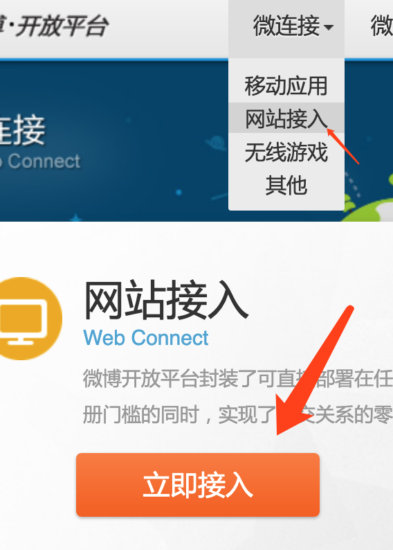 选择微链接-》网站接入=>立即接入 新建一个应用