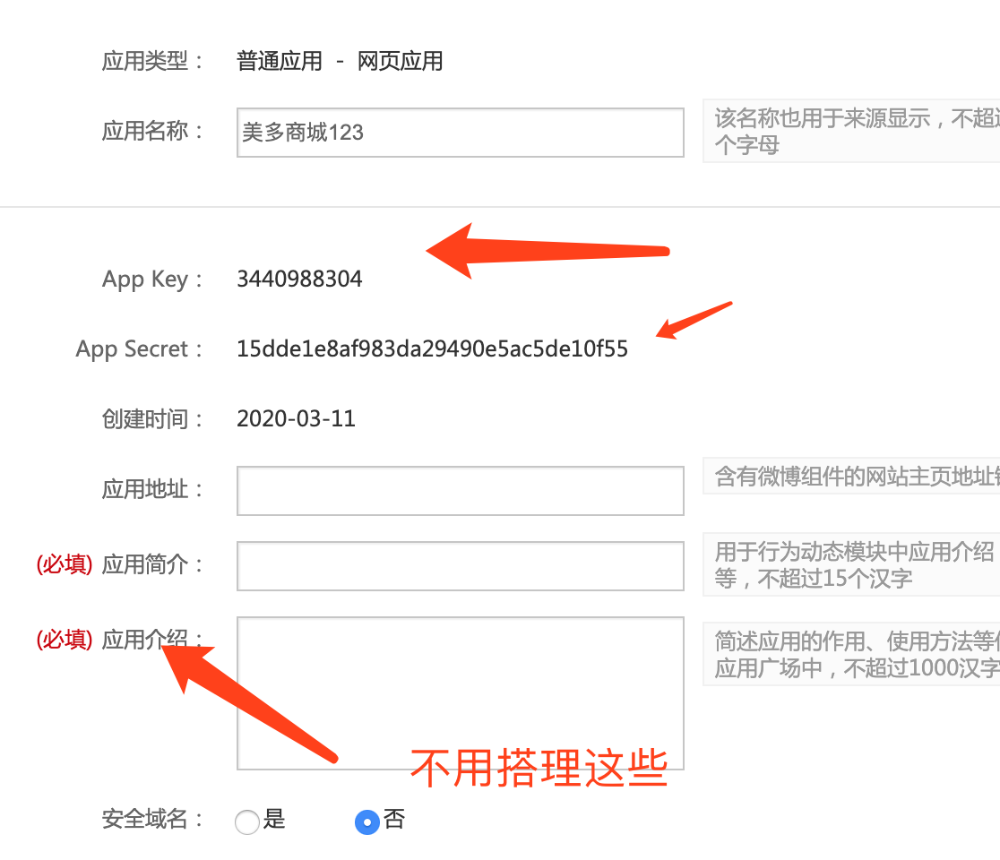 应用创建成功后,会立即跳转审核页面,需要填写一些资质,用来进行审核,其实这些审核字段都不用搭理,应用压根就不需要通过审核