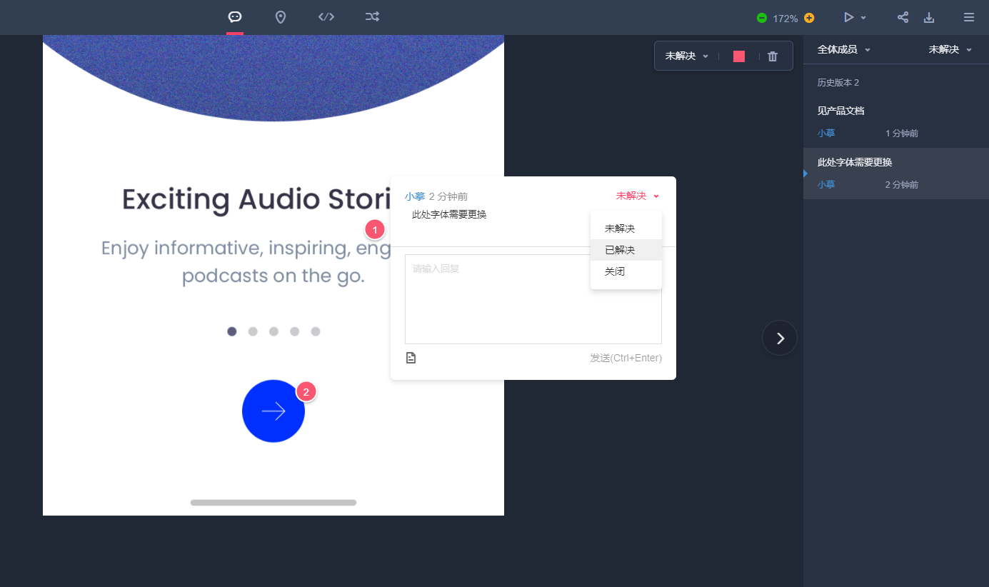 摹客为用户提供了更为科学的未解决、已解决、关闭三种评论状态。根据对应评论修改设计稿后, 设计师可以将评论标记为已解决,不重要的信息可以选择关闭。此外,不只是设计师本人,项目经理等管理角色也可以很方便地跟踪设计修改的情况,清晰明了地查看反馈意见的解决情况。