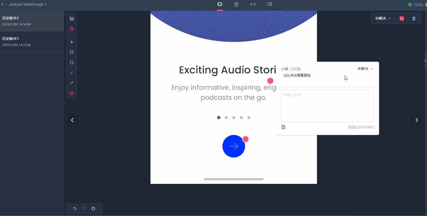当设计师对设计稿进行修改,重新上传后会自动生成历史版本,评论会跟随版本显示,无需担心评论丢失问题,且不会发生多版本评论冲突的情况,方便设计师检查反馈意见的解决情况。