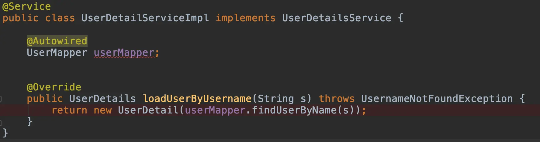 这个接口用户自己实现过后,返回一个UserDetails实例,将用于构建Authentication存储在中的对象SecurityContextHolder