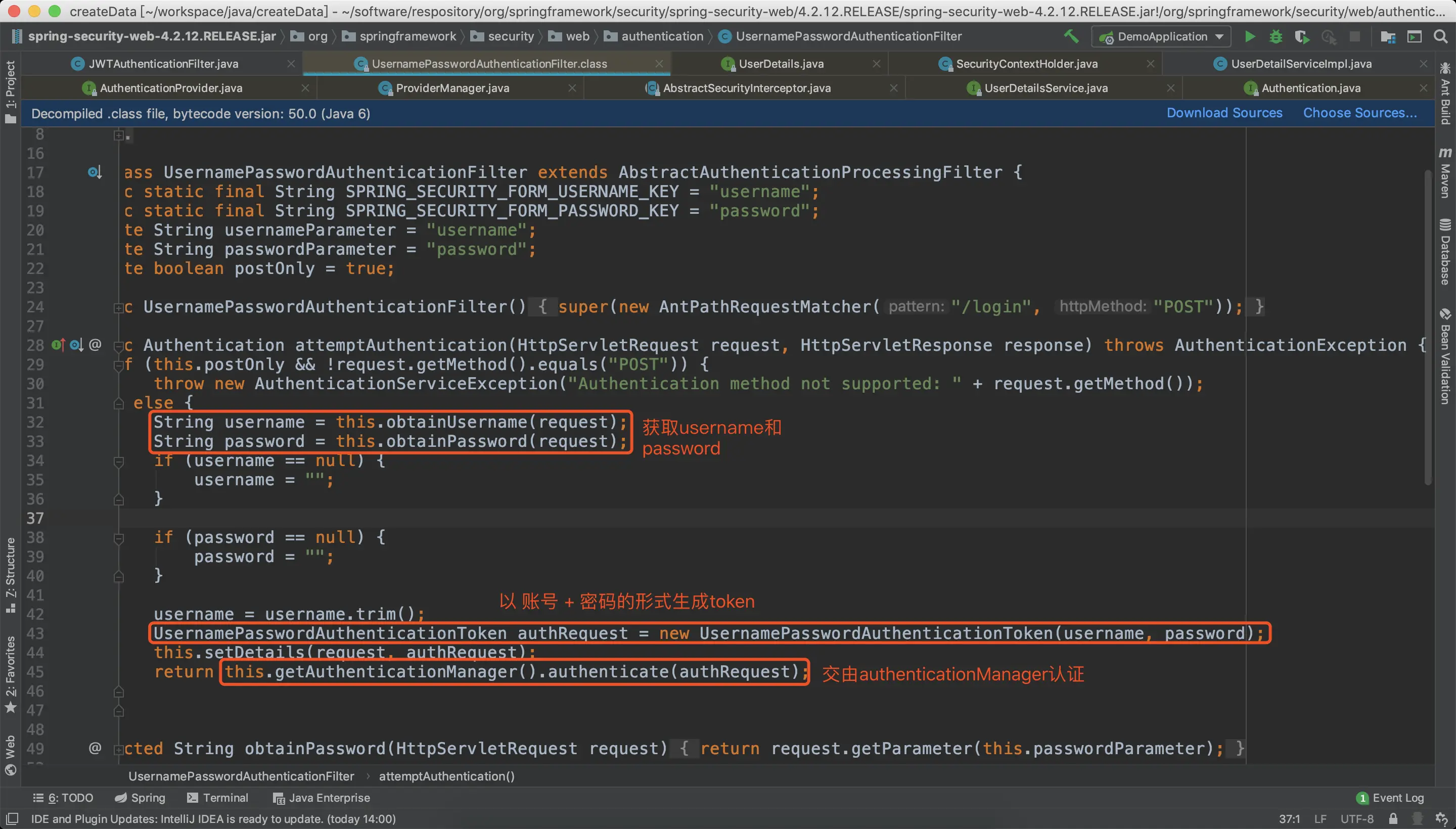 - 获取用户名和密码,并将其组合到的一个实例UsernamePasswordAuthenticationToken中。
