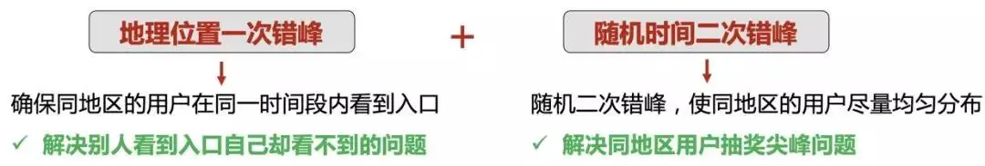 上述两种错峰方式,第二种与本次春节红包活动场景是比较吻合的。不过,该方案存在一个问题:由于其随机性,使得有用户反馈身边其他人都能看到活动入口参与抽奖了,而自己却一直看不到入口。针对方案二的问题,我们引入了用户地理位置的因素进行改进,下图描述了总体错峰方案: