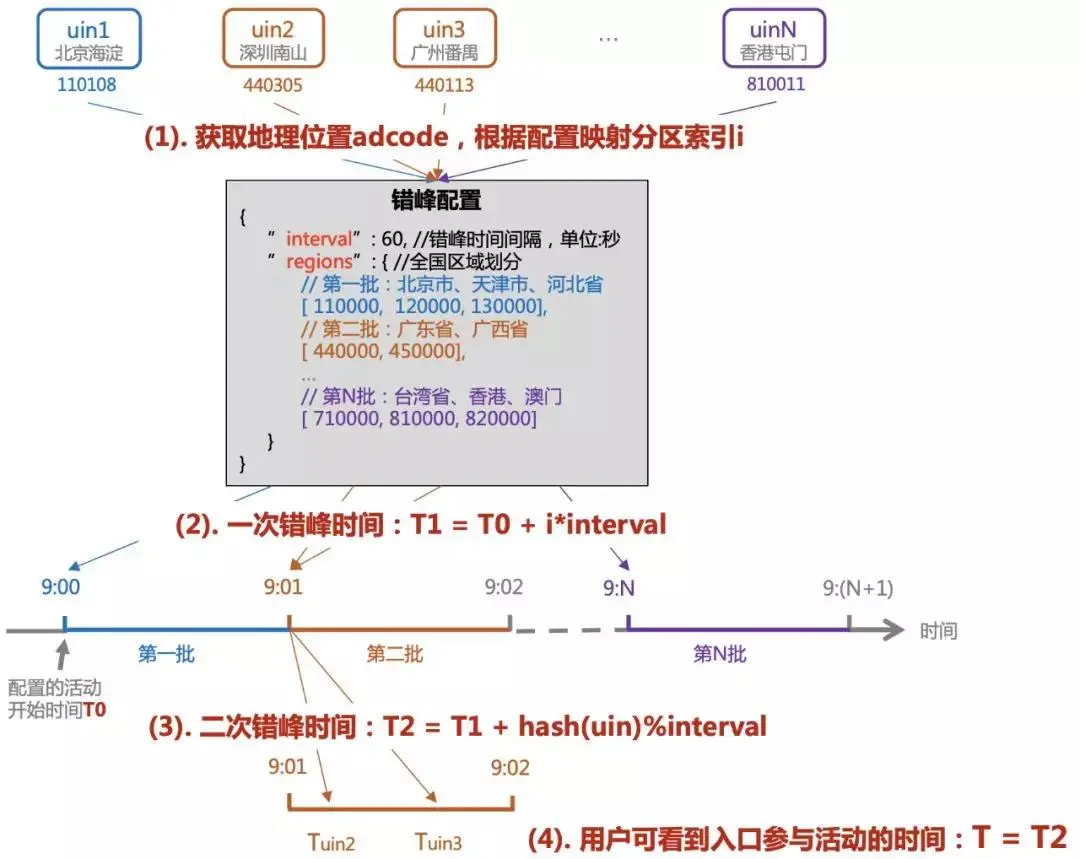 首先,我们定义了一份错峰配置,包含错峰时间间隔和区域划分列表,将全国用户根据地理位置adcode划分为多个区域批次。对处于同一批次的用户,他们看到活动入口的时间段是一样的。假设配置活动的开始时间为9:00,错峰时间间隔为1分钟,那么第一批用户能看到入口的时间为9:00~9:01,第二批用户能看到入口的时间为9:01~9:02,以此类推。主要流程如下: