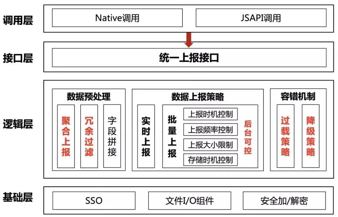 - 逻辑层主要包括数据预处理、数据上报策略和容错机制三部分内容。其中,数据预处理负责对上报的数据进行聚合、过滤和转换;数据上报策略通过后台可控的参数来控制数据上报的时机、频率、大小和存储,确保数据能够及时上报又不影响客户端和后台的性能,而且能够实时动态调整;容错机制制定了过载策略和降级策略,提供应对上报后台过载的措施;