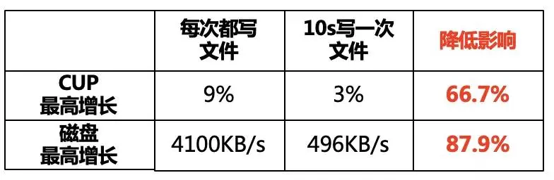- 缩短保存文件的时间间隔(对多个值测试综合性能和时间效率考虑取值10秒),后台可控,并进行多时机补偿,包括前后台切换、杀进程和App Crash三种场景。经测试,对比每次都写文件,每10秒写一次文件能够降低对CPU影响66.7%,降低对磁盘的影响87.9%。