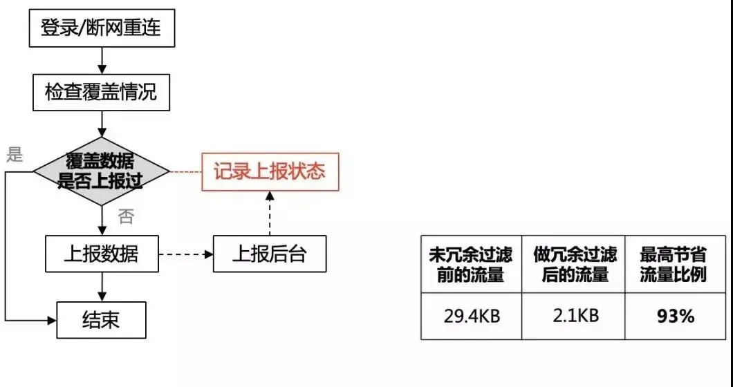 - 确保关键指标数据上报成功,并过滤冗余数据。把覆盖类指标每日一检的方式改为每次登录/断网重连时就触发覆盖检查,并加上一定的频控,覆盖检查得出结果后即上报。当覆盖数据实际触发上报到后台并成功回包后,本地记录上报的状态,这样当下次触发覆盖检查上报前,若判断该覆盖数据已上报过,就不再上报,直接作为冗余数据过滤掉。相比每日一检的方式(每天都会产生多条覆盖数据上报),这种方式单用户最多可以节省93%的覆盖数据量。