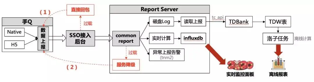 在客户端数据上报到后台的链路中,SSO接入层和上报服务后台均有过载的风险。针对这两个风险,我们分别用过载策略和降级策略来应对。