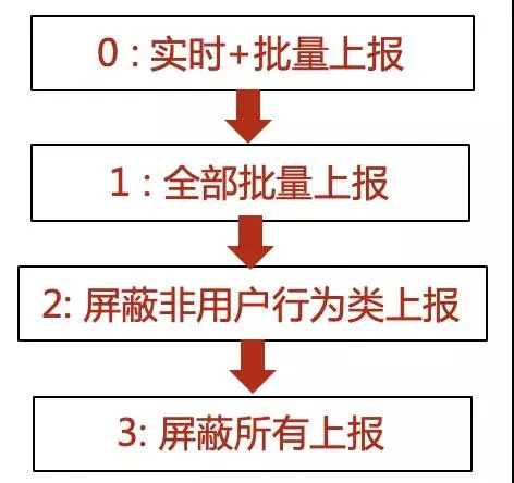 我们设定了4个上报级别,如下图所示,客户端根据后台设置的上报级别,来降级上报服务。如果上报级别设置为1,则客户端会将所有实时上报降级为批量上报;更进一步的,可以设置上报级别为2来降级屏蔽非用户行为类的数据上报;甚至可以设置上报级别为3来屏蔽所有数据的上报。通过上报级别有效时间,来确保客户端能够恢复正常的上报逻辑。