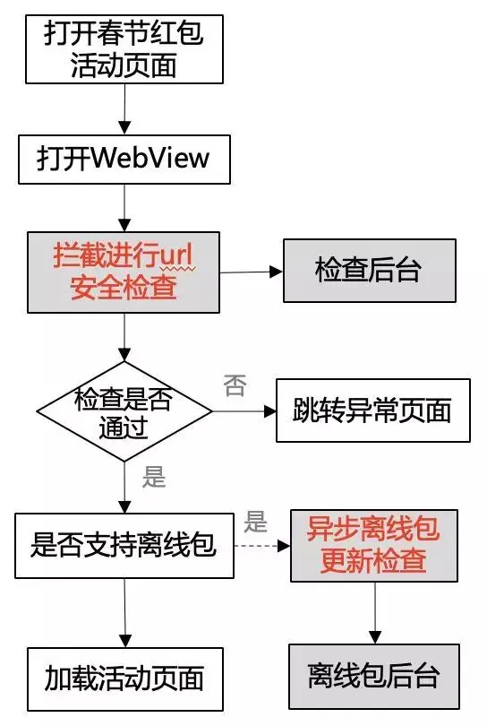 为消除对检查后台的影响,采取的措施是针对所有春节红包活动的页面屏蔽url安全检查。通过在配置中添加url安全检查开关和url前缀列表来进行控制,所有活动页面的url走内部域名。另外,屏蔽url安全检查在一定程度上还可以加快活动页面的加载速度,弱网环境下会更加明显。