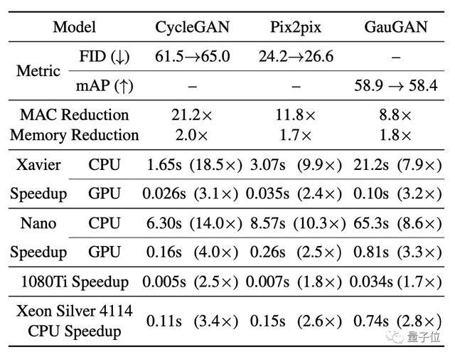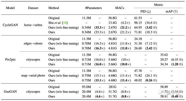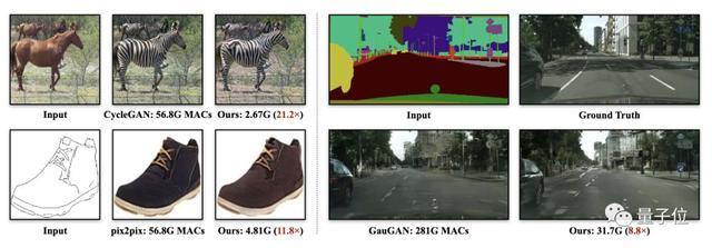 这种方法将CycleGAN的计算量压缩了20倍以上,将pix2pix的计算量压缩了9倍以上,将GauGAN的计算量压缩了9倍。