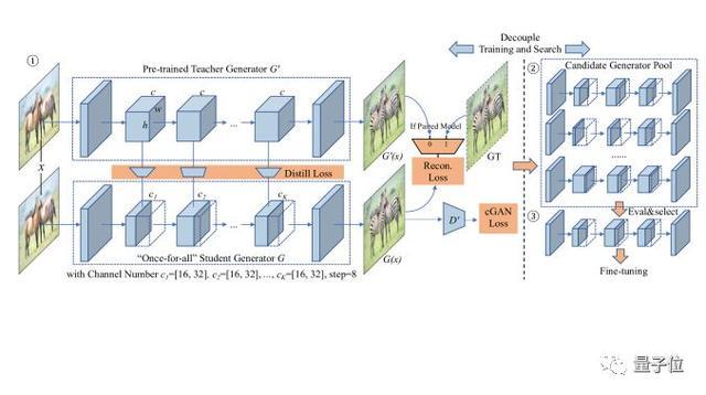 GAN压缩的框架如下图所示,主要分为3个部分: