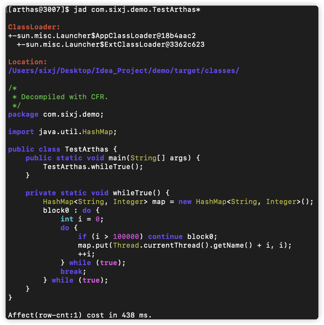 使用Arthas自带的反编译方法jad,输入命令: