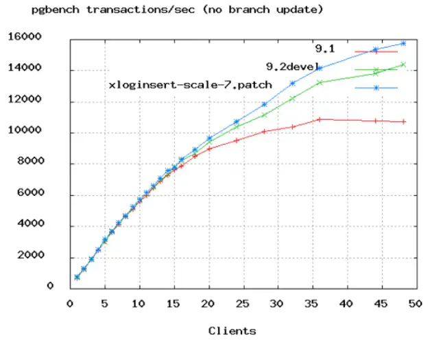 上图是PostgreSQL的benchmark数据,可以看到TPS增长率从50个连接数开始变缓。在上面Oracle的视频中,他们把连接数从2048降到了96,实际上96都太高了,除非服务器有16或32颗核心。