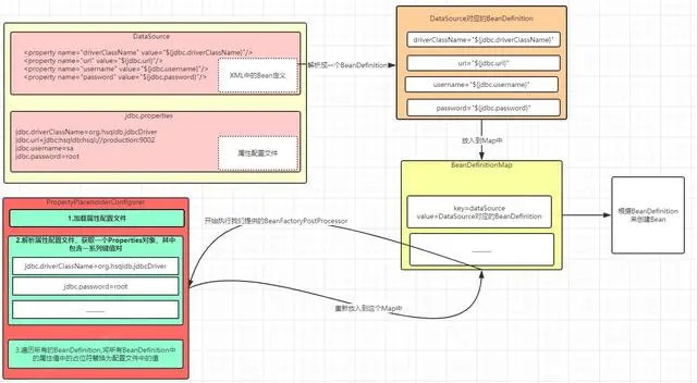 这个流程就如上图,可以看到我们通过PropertyPlaceholderConfigurer这个特殊的BeanFactoryPostProcessor完成了BeanDefinition中的属性值中的占位符的替换。在BeanDefinition被解析出来后,Bean实例化之前对其进行了更改了。