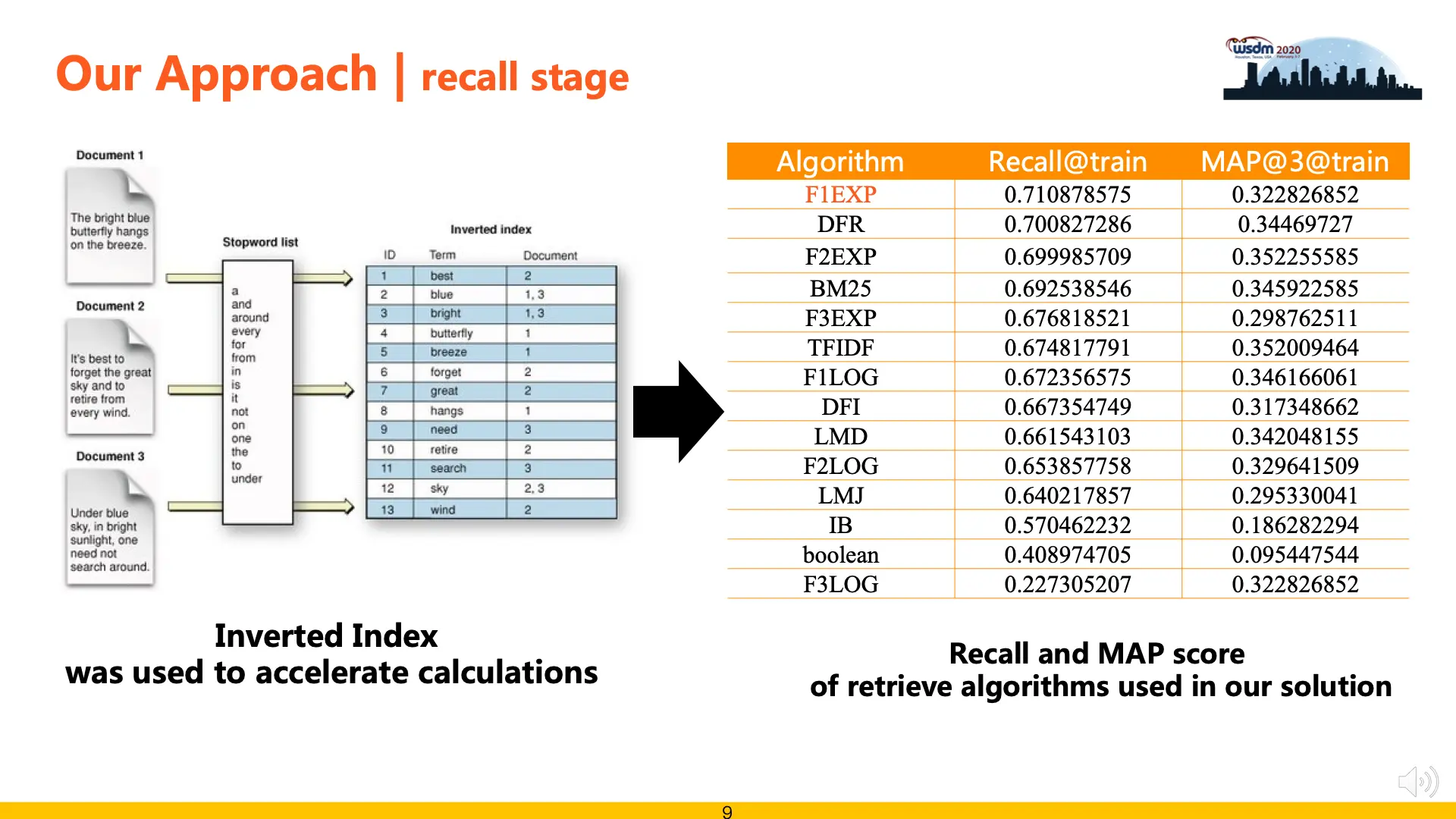 为了提升召回算法的效果,我们使用倒排索引技术对数据进行建模,然后在此基础上实现了F1EXP、DFR、F2EXP、BM25、TFIDF等多种检索算法,极大了提升了召回部分的运行效率。为了平衡召回率和计算成本,最后使用F1EXP、BM25、TFIDF 3种算法各召回50条结果融合作为后续精排候选数据,在验证集上测试,召回覆盖率可以到70%。