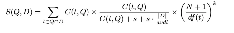 其中,Q表示查询query ,D表示候选文档,C(t, Q)是词t在Q中的频次,|D|表示文档长度,avdl为文档的平均长度,N为文档总数,df(t)为词t的文档频率。