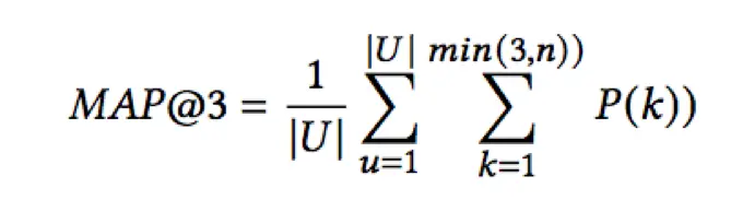 评测使用的评价指标为Mean Average Precision @3 (MAP@3), 形式如下: