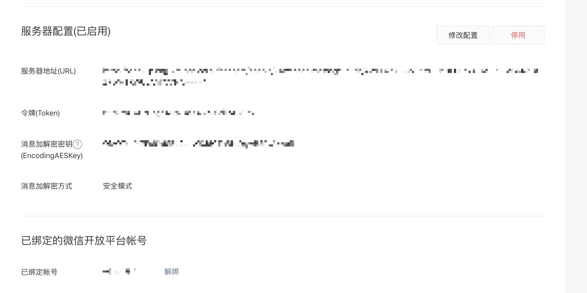 开通之后需要将消息推送的相关配置项配置到小程序或者公众号后台,此教程为实现接收微信卡券核销事件的消息的功能,所以需要将配置项配置到公众号后台。
