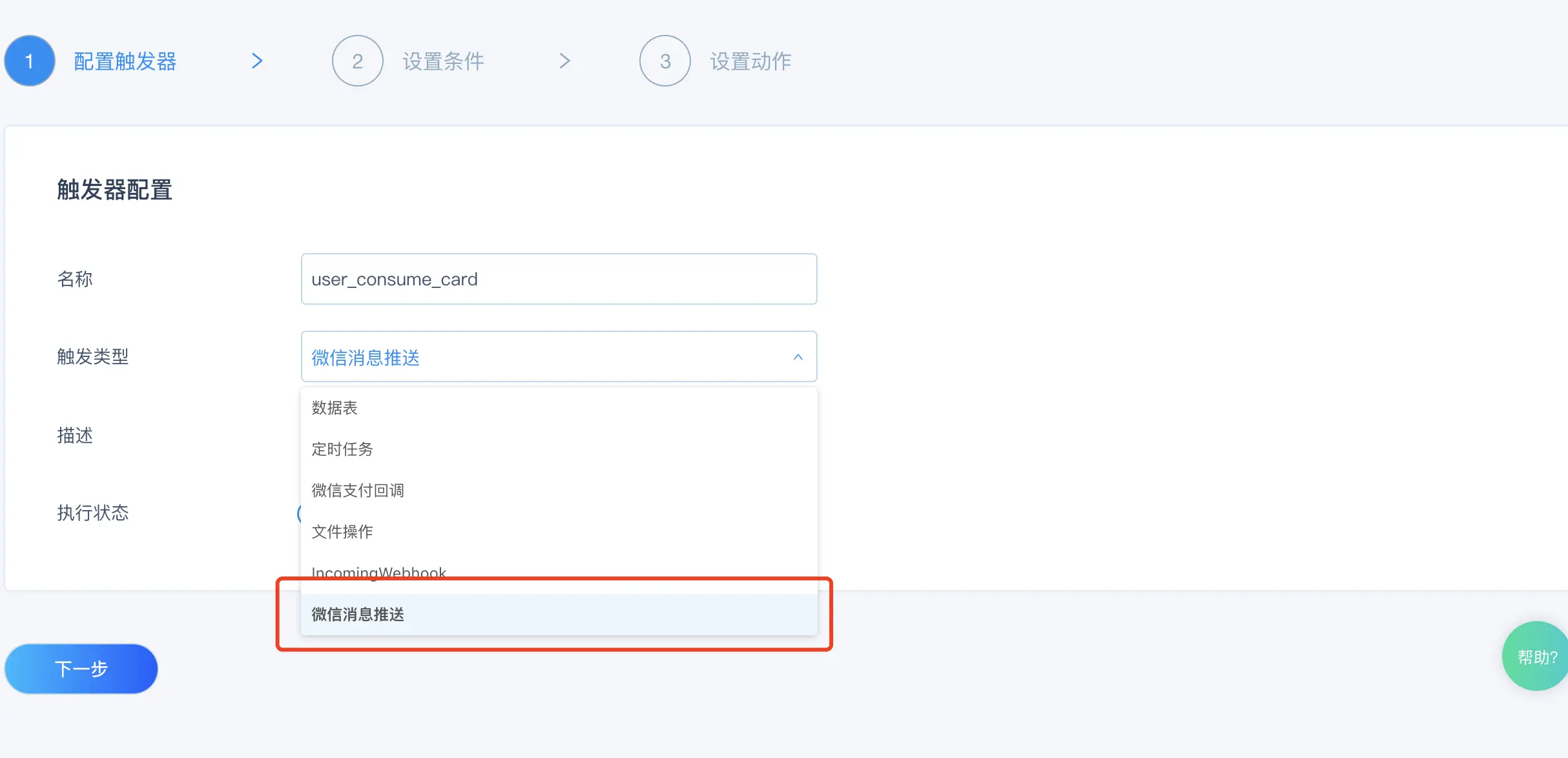 1.触发器配置,触发器类型一定要选择「微信消息推送」