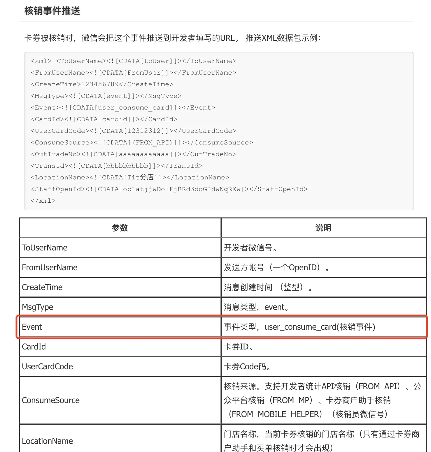 此教程为卡券核销事件推送,因此触发条件就为 evnet = user_consume_card 的事件: