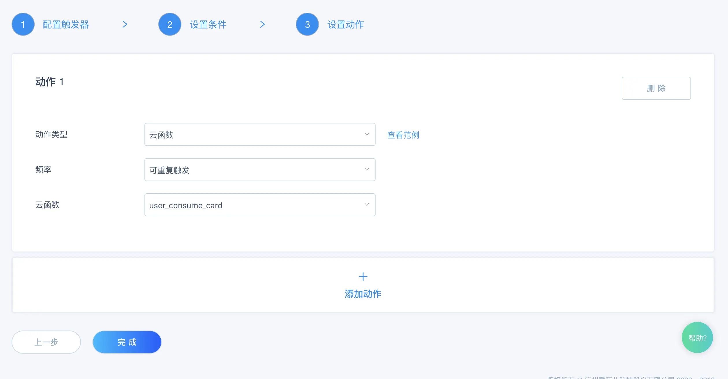 动作类型选择云函数,当然你也可以选择其他的动作类型,选中我们创建云函数步骤中创建的云函数,配置好之后,当用户核销卡券时即会触发该触发器,并调用对应的云函数。至此,我们的微信消息推送触发器的 Demo 就完成了。