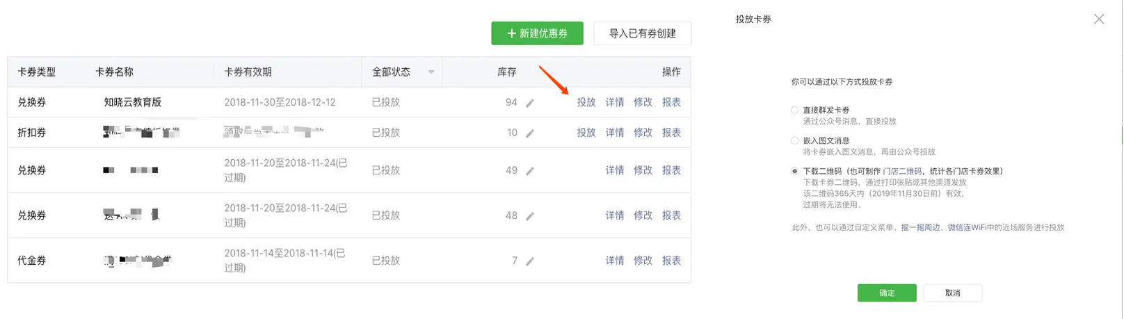 审核通过后即可投放,支持二维码、公众号图文、群发、摇周边等多种形式投放,这里选择下载二维码进行投放