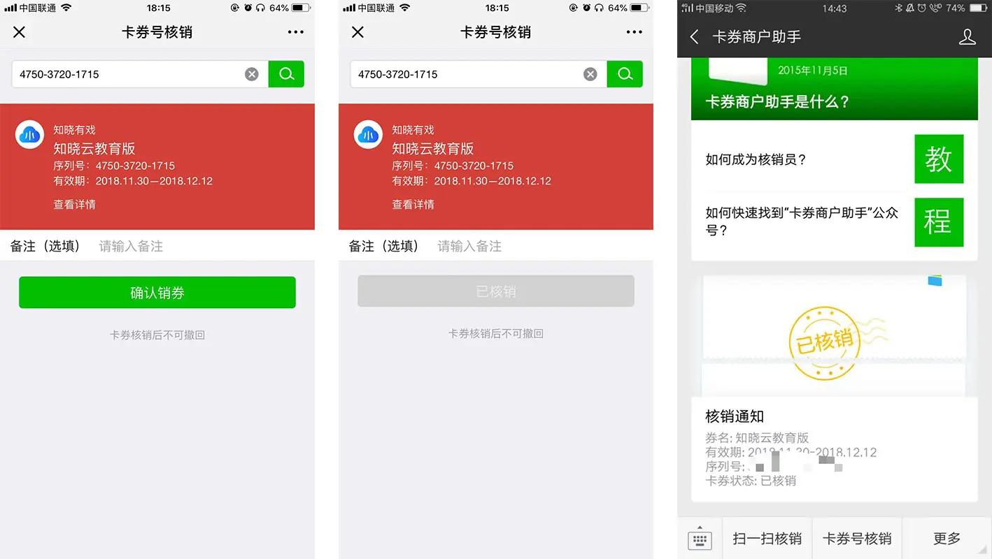 添加核销员后,店员可在「卡券商户助手」中选择「扫一扫核销」|者「卡券号核销」
