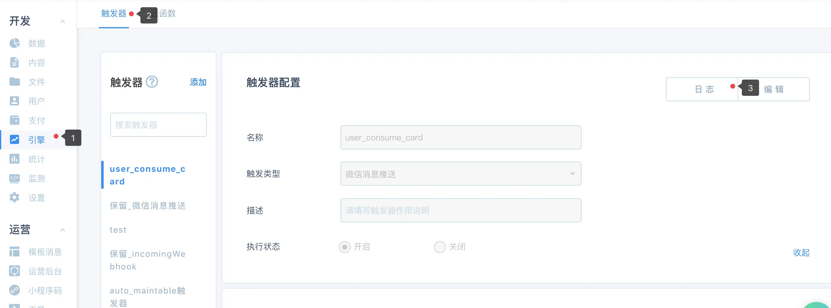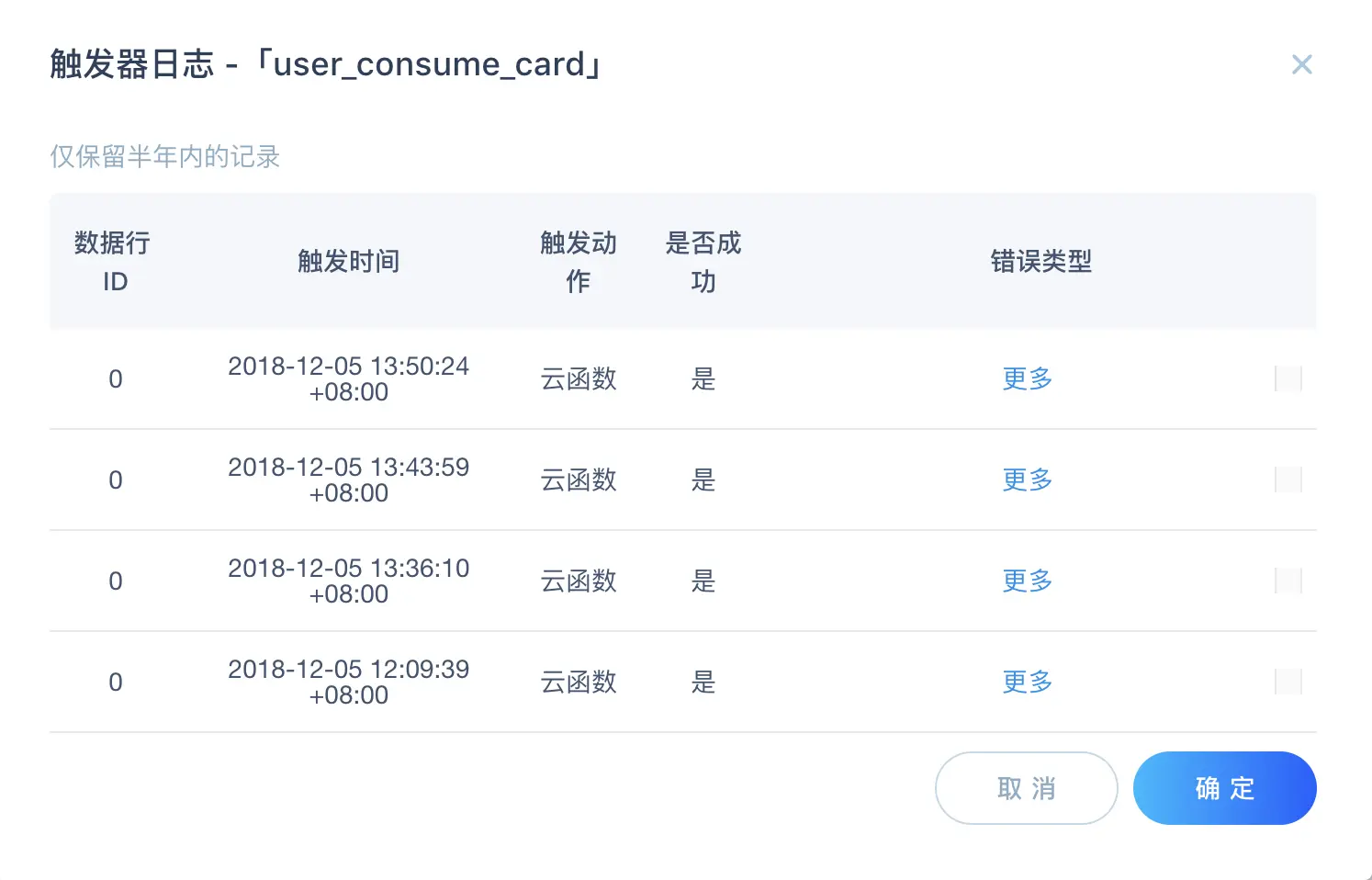 卡券核销之后,可以在知晓云控制台 -> 引擎 -> 触发器,找到之前创建的触发器( user_consume_card ),查看日志。