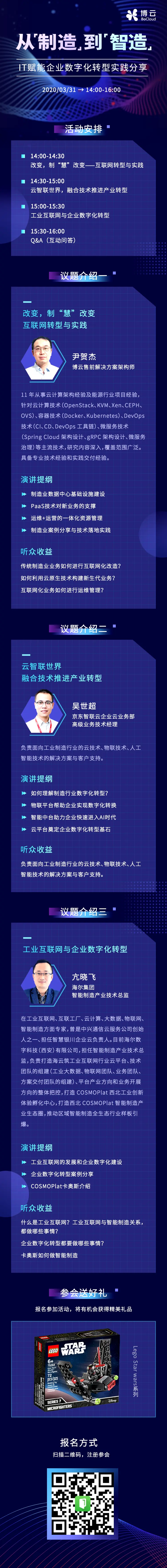 直播预告 | 从“制造”到“智造”,IT赋能企业数字化转型实践分享 博云技术社区 2020-03-26 253 阅读1分钟 传统制造业业务如何进行互联网化改造?物联平台如何帮助企业实现数字化转换?工业互联网与智能制造关系,做哪些事?3月31日下午14:00-16:00博云、京东、海尔联手解答制造业企业数字化转型实践难题!