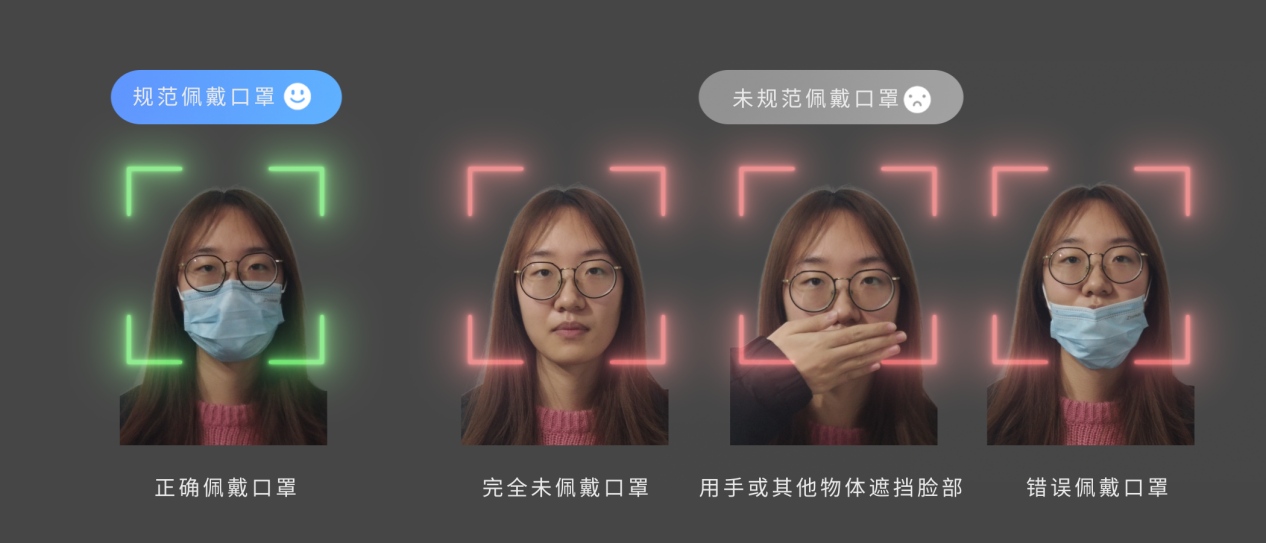 而在全新推出的“口罩佩戴检测算法”上,虹软视觉开放平台针对口罩种类丰富、佩戴位置多样等问题,在数据增强方面设计相应策略,提升了模型鲁棒性。该算法可有效识别是否规范佩戴口罩,如未佩戴口罩、错误佩戴口罩、用手或其他物体遮挡脸部等多种场景。复产企业、复课学校等可以利用该技术,及时提醒相关人员正确佩戴口罩,提升防控效率。